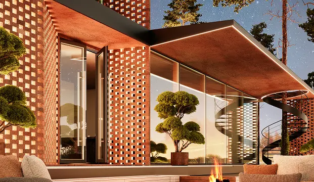 Почти незаметные в экстерьере роллеты со скрытым коробом позволяют управлять световым потоком: ночью затемняют комнаты, утром впускают в них бодрящий свет солнца. Защищают дом от шума, а остекление — от механических повреждений и осадков.