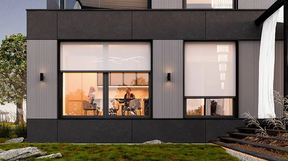 Почти незаметные в экстерьере роллеты со скрытым коробом позволяют управлять световым потоком: ночью затемняют комнаты, утром впускают в них бодрящий свет солнца. Защищают дом от шума, а остекление — от механических повреждений и осадков.