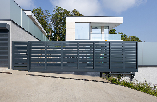 На фото: откатные ворота и калитка с заполнением из алюминиевых профилей шириной 82 мм.