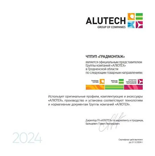 ЧП «ГрадМонтаж» – официальный представитель Группы компаний «АЛЮТЕХ». Основное направление деятельности – оптовая торговля, установка инженерного оборудования. Опыт работы нашей компании внушителен – работаем с 1997 года. Обратившись к нам, Вы сможете полностью положиться на нас во всех вопросах – от замера проема, до установки изделия и дальнейшего сервисного обслуживания. Более 25 лет мы помогаем нашим клиентам подобрать подходящие защитные конструкции для дома, офиса или промышленных объектов. Доставляем и устанавливаем секционные ворота (гаражные и промышленные), рольворота, въездные конструкции (распашные и откатные ворота), роллеты, роллетные решетки, автоматику и другое.
